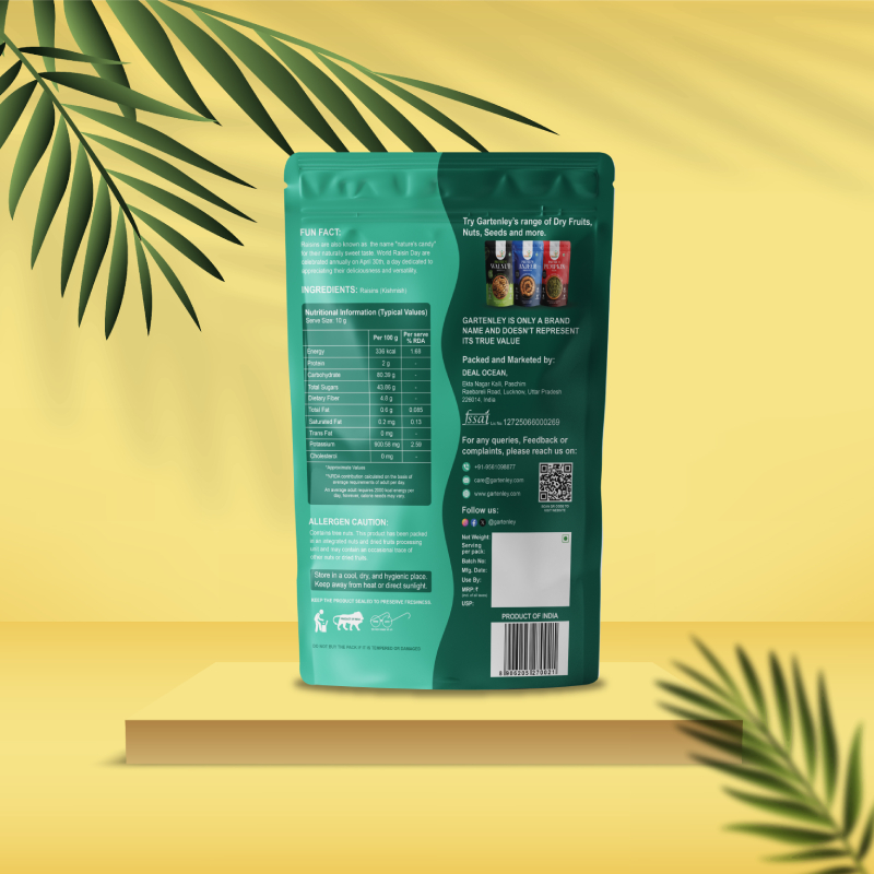 • Natural Energy Source: Raisins are rich in natural sugars (glucose and fructose) which provide a quick, sustained energy boost, making them an ideal pre-workout or midday snack.